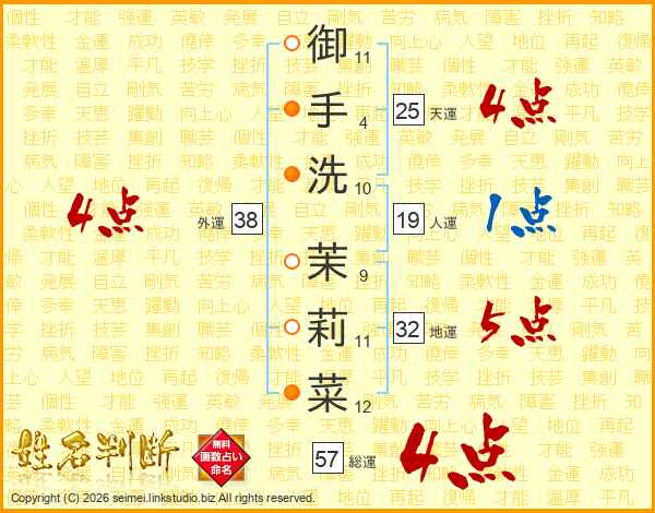 御(11画)手(4画)洗(10画) 茉(9画)莉(11画)菜(12画)