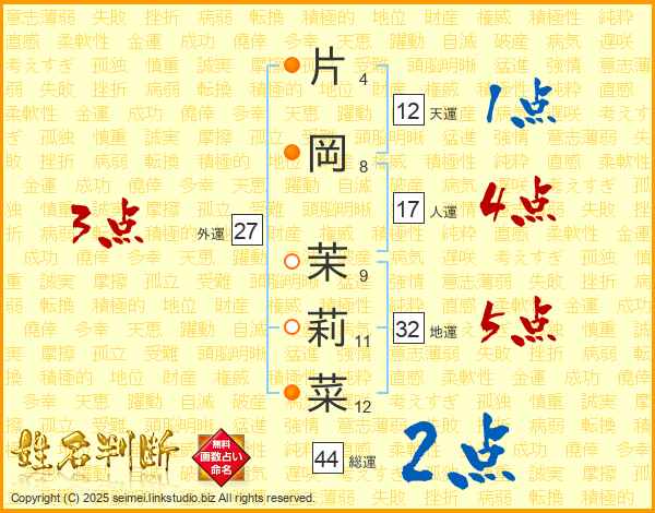 片(4画)岡(8画) 茉(9画)莉(11画)菜(12画)
