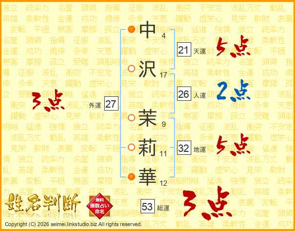 中沢茉莉華さんの総運は53画の3点!