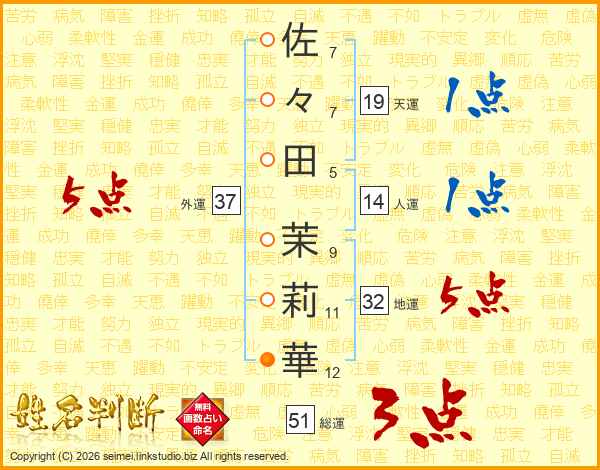 佐々田茉莉華さんの外運は37画の5点!