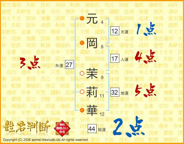 元(4画)岡(8画) 茉(9画)莉(11画)華(12画)