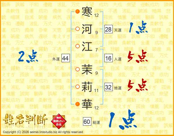 寒(12画)河(9画)江(7画) 茉(9画)莉(11画)華(12画)
