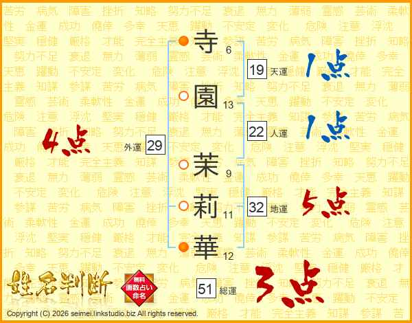 寺(6画)園(13画) 茉(9画)莉(11画)華(12画)