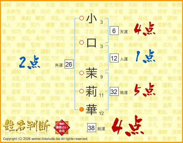 小口茉莉華さんの総運は38画の4点!