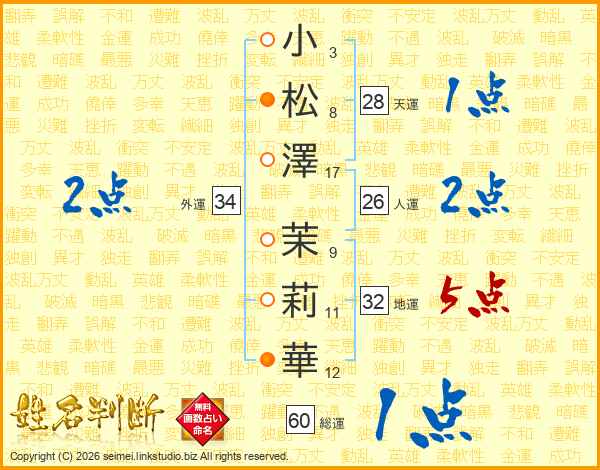 小(3画)松(8画)澤(17画) 茉(9画)莉(11画)華(12画)
