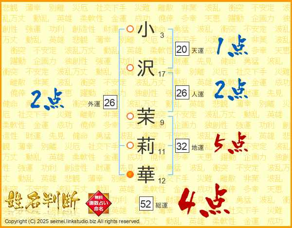 小(3画)沢(17画) 茉(9画)莉(11画)華(12画)