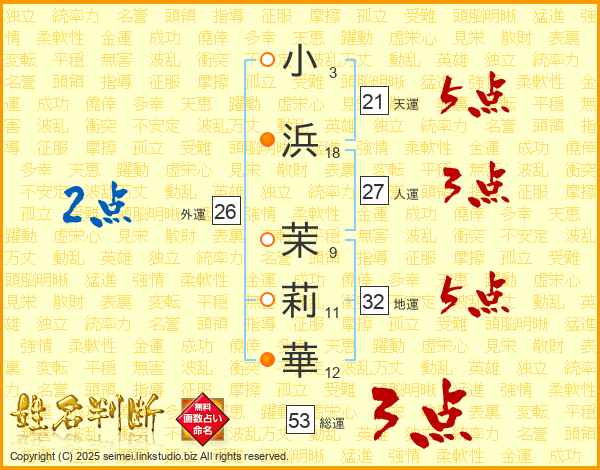 小(3画)浜(18画) 茉(9画)莉(11画)華(12画)