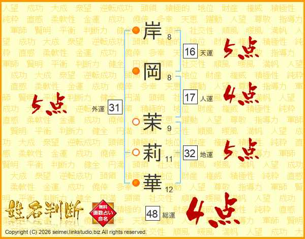 岸(8画)岡(8画) 茉(9画)莉(11画)華(12画)