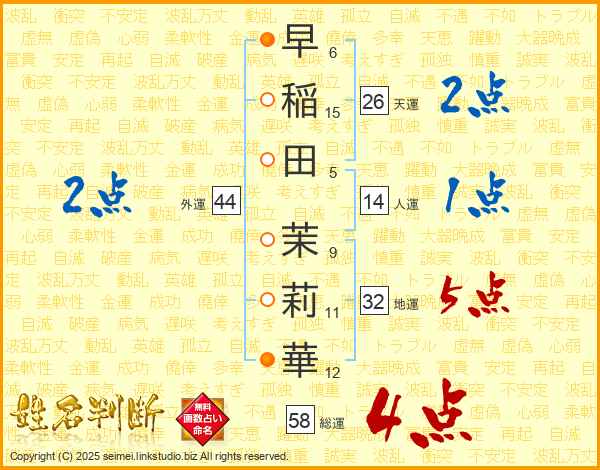 早(6画)稲(15画)田(5画) 茉(9画)莉(11画)華(12画)
