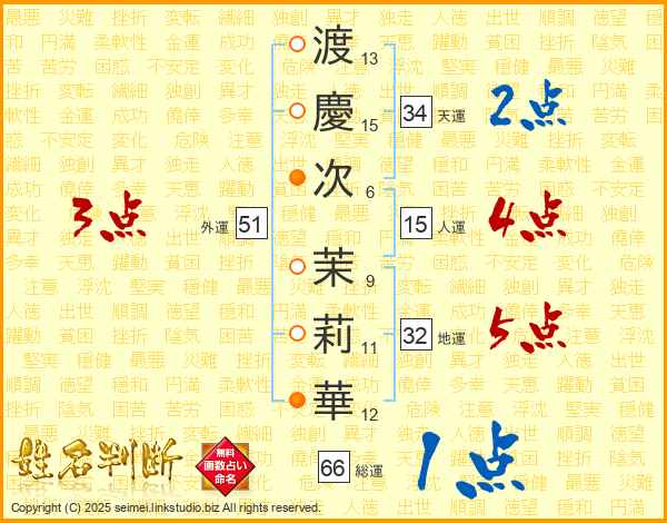 渡(13画)慶(15画)次(6画) 茉(9画)莉(11画)華(12画)