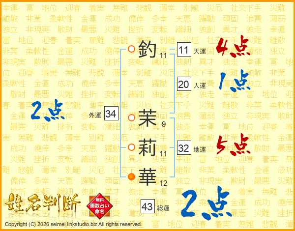 釣茉莉華さんの総運は43画の2点!