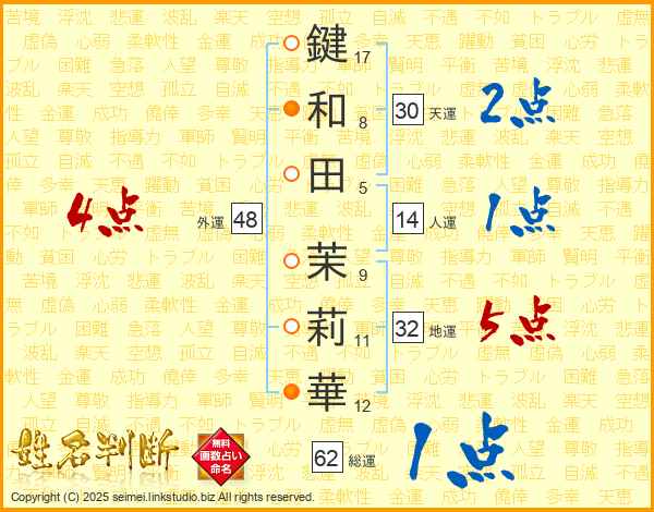 鍵(17画)和(8画)田(5画) 茉(9画)莉(11画)華(12画)