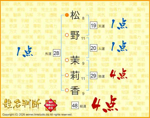松(8画)野(11画) 茉(9画)莉(11画)香(9画)
