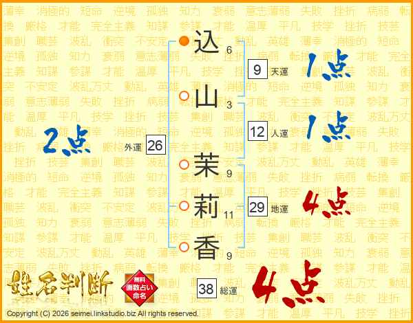 込山茉莉香さんの総運は38画の4点!