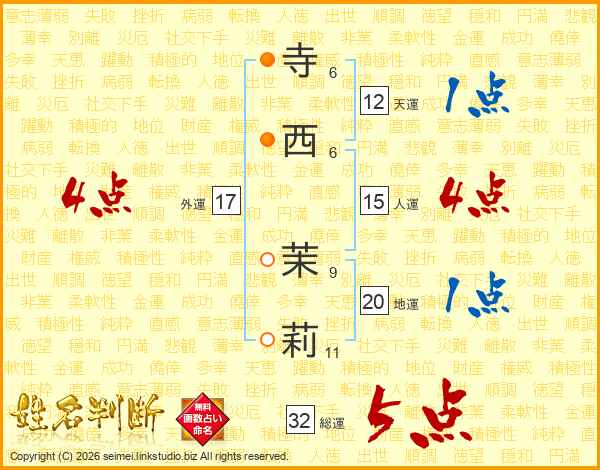 寺(6画)西(6画) 茉(9画)莉(11画)