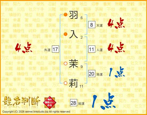 羽(6画)入(2画) 茉(9画)莉(11画)
