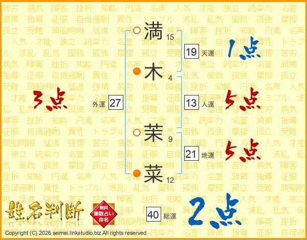 満(15画)木(4画) 茉(9画)菜(12画)