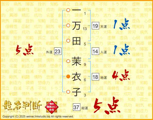 一(1画)万(13画)田(5画) 茉(9画)衣(6画)子(3画)