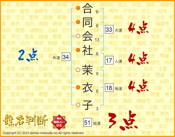 合(6画)同(6画)会(13画)社(8画) 茉(9画)衣(6画)子(3画)