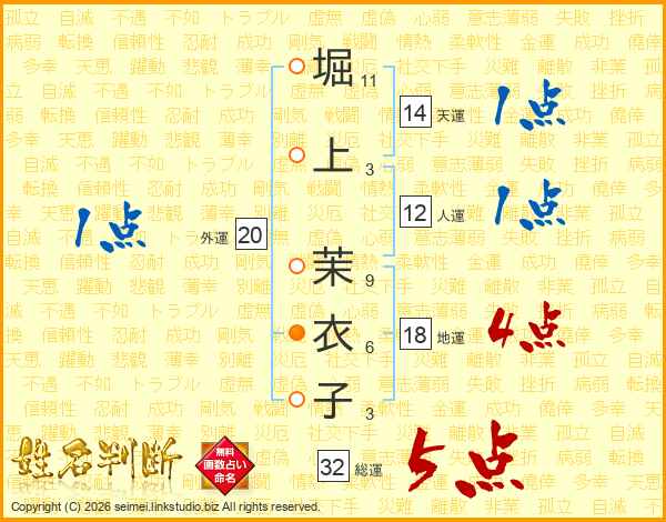 堀(11画)上(3画) 茉(9画)衣(6画)子(3画)