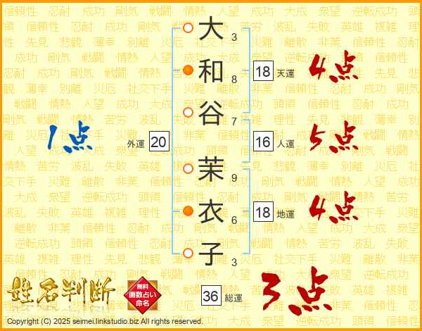 大(3画)和(8画)谷(7画) 茉(9画)衣(6画)子(3画)