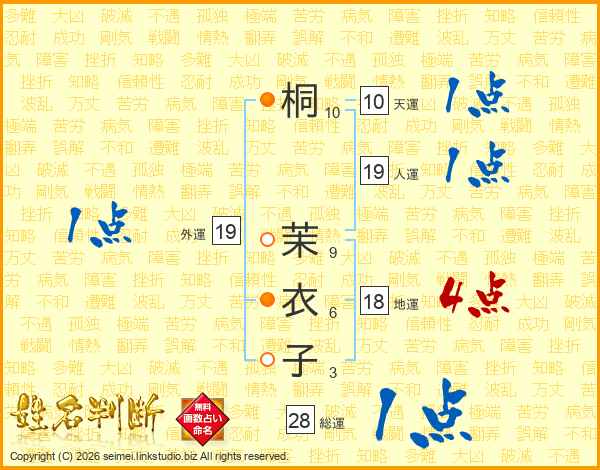桐(10画) 茉(9画)衣(6画)子(3画)