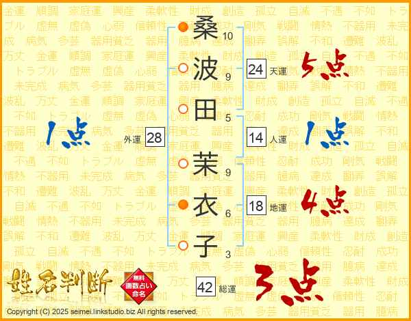 桑(10画)波(9画)田(5画) 茉(9画)衣(6画)子(3画)