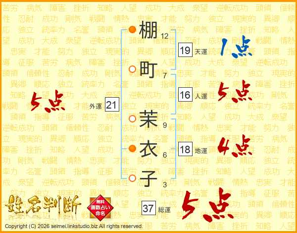 棚(12画)町(7画) 茉(9画)衣(6画)子(3画)