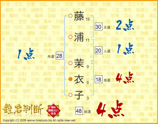 藤(19画)浦(11画) 茉(9画)衣(6画)子(3画)