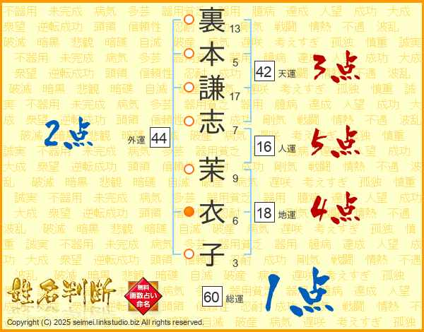裏(13画)本(5画)謙(17画)志(7画) 茉(9画)衣(6画)子(3画)
