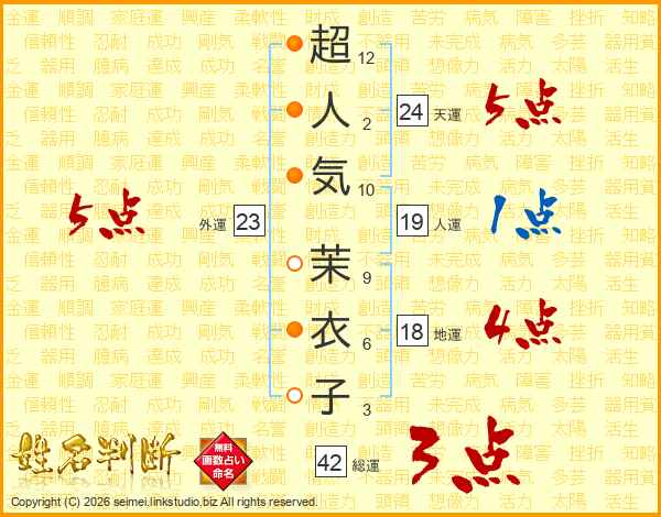 超人気茉衣子さんの総運は42画の3点!