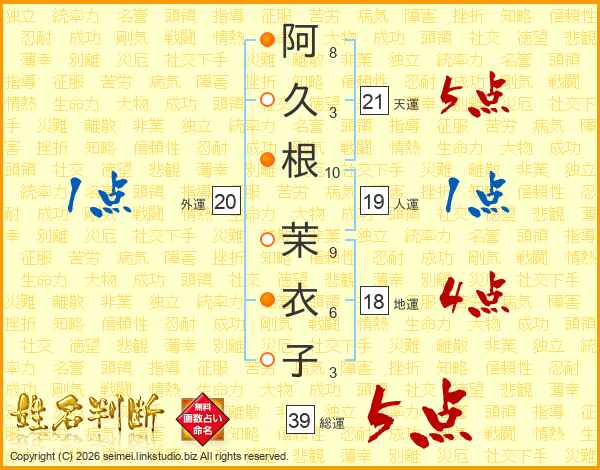 阿(8画)久(3画)根(10画) 茉(9画)衣(6画)子(3画)