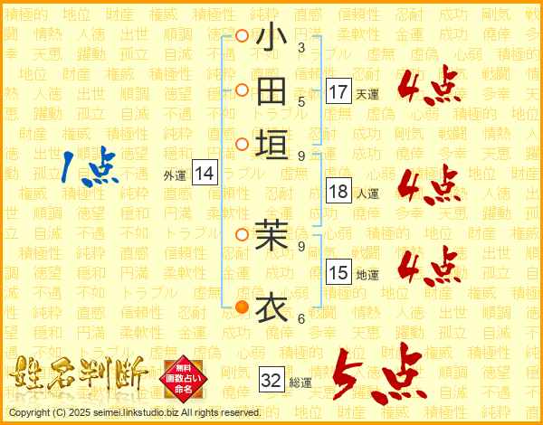 小(3画)田(5画)垣(9画) 茉(9画)衣(6画)