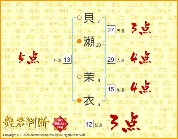 貝(7画)瀬(20画) 茉(9画)衣(6画)
