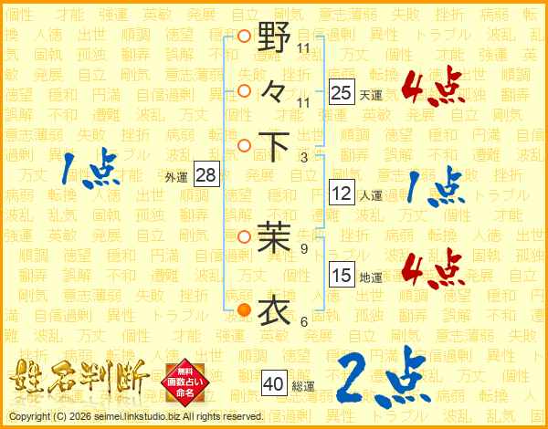 野々下茉衣さんの総運は40画の2点!
