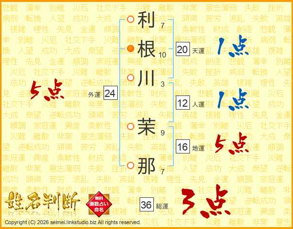 利(7画)根(10画)川(3画) 茉(9画)那(7画)
