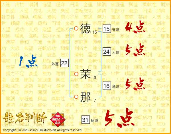 徳茉那さんの総運は31画の5点!