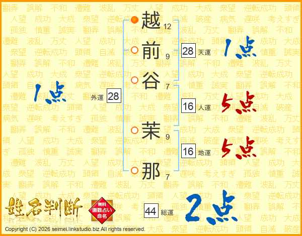 越前谷茉那さんの総運は44画の2点!