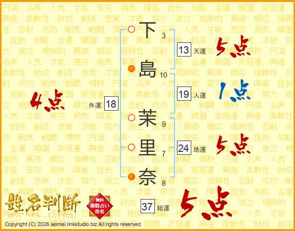 下(3画)島(10画) 茉(9画)里(7画)奈(8画)