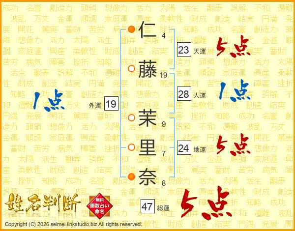 仁(4画)藤(19画) 茉(9画)里(7画)奈(8画)
