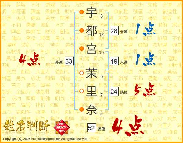 宇(6画)都(12画)宮(10画) 茉(9画)里(7画)奈(8画)