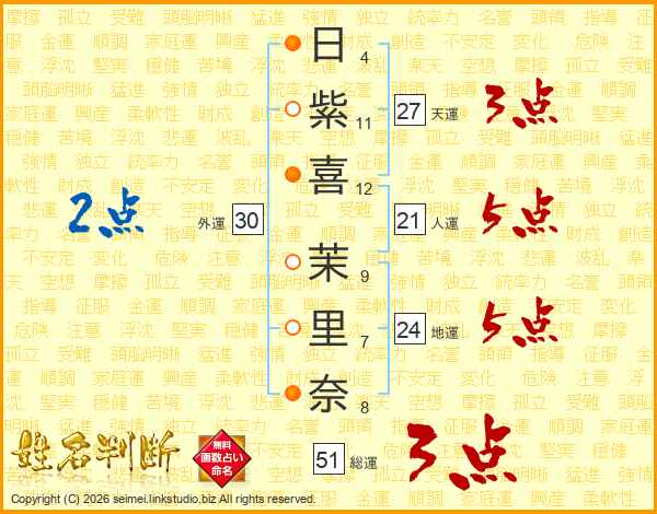日(4画)紫(11画)喜(12画) 茉(9画)里(7画)奈(8画)