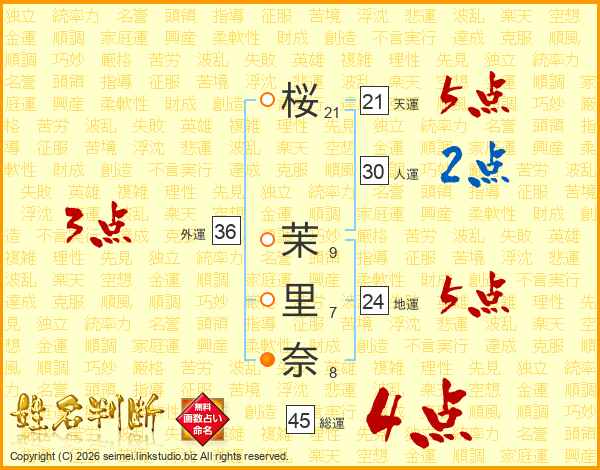 桜(21画) 茉(9画)里(7画)奈(8画)