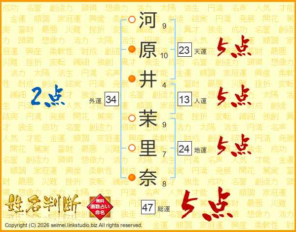 河(9画)原(10画)井(4画) 茉(9画)里(7画)奈(8画)