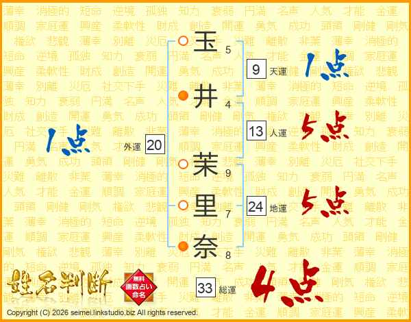 玉(5画)井(4画) 茉(9画)里(7画)奈(8画)