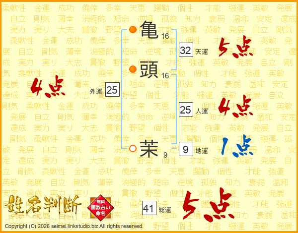 亀(16画)頭(16画) 茉(9画)