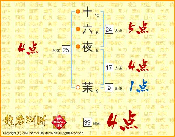 生活面を象徴する運勢です。外部から受ける影響力を表し、結婚運、家庭運や職場、環境への順応性を表します。総運から人運を引いた画数。姓や名が1文字の場合を除く。