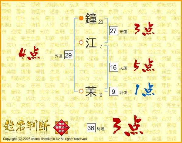 あなたの人生を表す1番重要な運勢です。生涯を通じて影響する総合運となり、主に50歳以降の晩年期に影響を及ぼします。苗字と名前の合計画数。