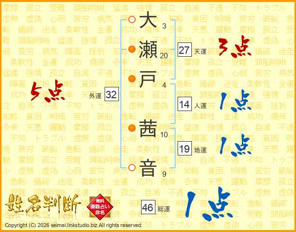 大(3画)瀬(20画)戸(4画) 茜(10画)音(9画)