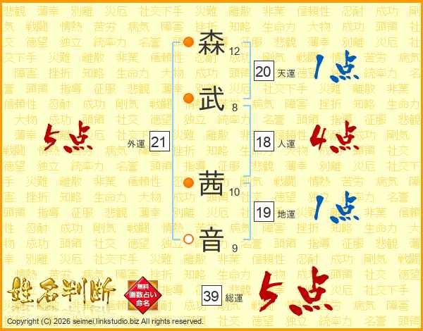 森(12画)武(8画) 茜(10画)音(9画)